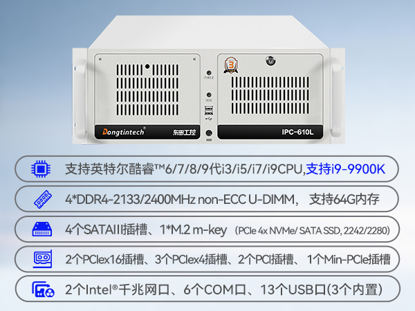 東田工控DT-610L-BQ270MA是一款4U機架式工控機,采用酷睿9代i99900k處理器,擁有5個PCIe插槽,至多可擴展20個網(wǎng)口。支持多種操作系統(tǒng)。內存4*DDR4至高64G。內存巨大,使用快速流暢,支持定制。